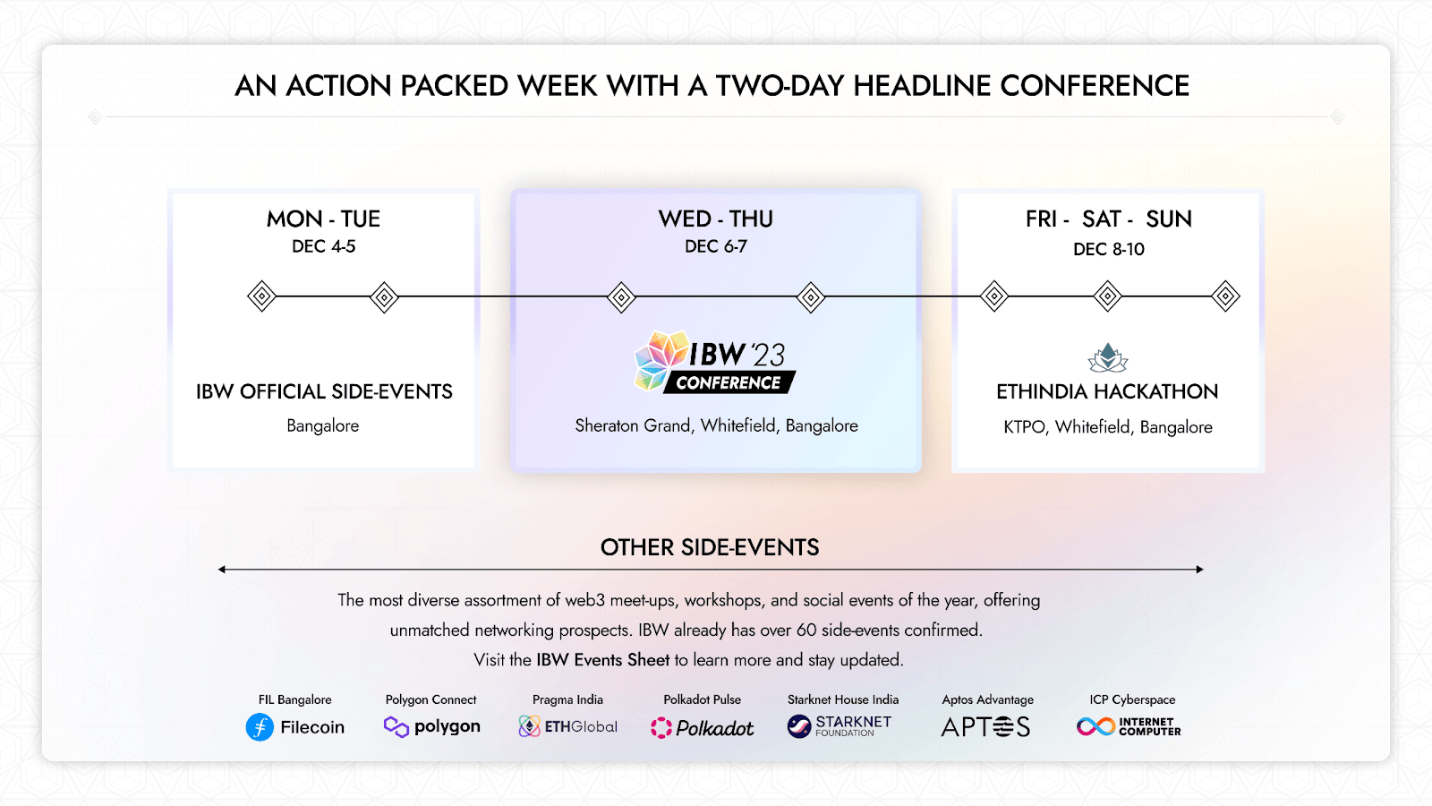 There will be over 60+ web3 events, including flagship events such as the headline IBW Conference, ETHIndia, Polygon Connect, Polkadot Pulse, FILBangalore, and many other side-events, networking events, workshops, parties etc hosted by Indian & global blockchain industry stakeholders.