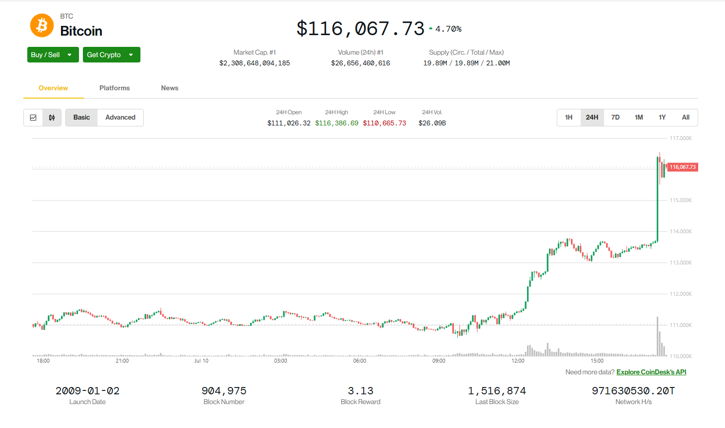 The largest and oldest cryptocurrency hit $115,469 during the U.S. session, CoinDesk price data shows. It was up 4.3% over the past 24 hours.