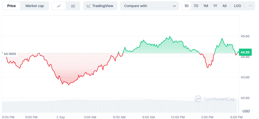 In mid-August, a whale deposited $19.38 million USDC into Hyperliquid, positioning buys in the $45–46 range. This follows earlier purchases totaling $28 million from other large holders, underscoring sustained accumulation from deep-pocketed investors.