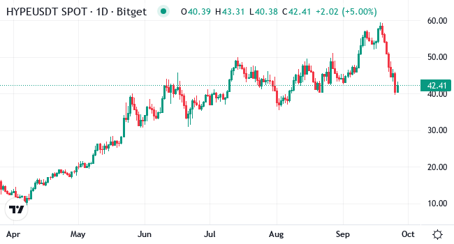 Beyond fundamentals, the technical picture for HYPE also reflects a market at a crossroads. The token is currently trading below the 7-day ($46.8) and 30-day ($49.54) SMAs, signaling short-term weakness. However, it still holds comfortably above the 200-day SMA ($33.7), showing that long-term bullish structure remains intact.
