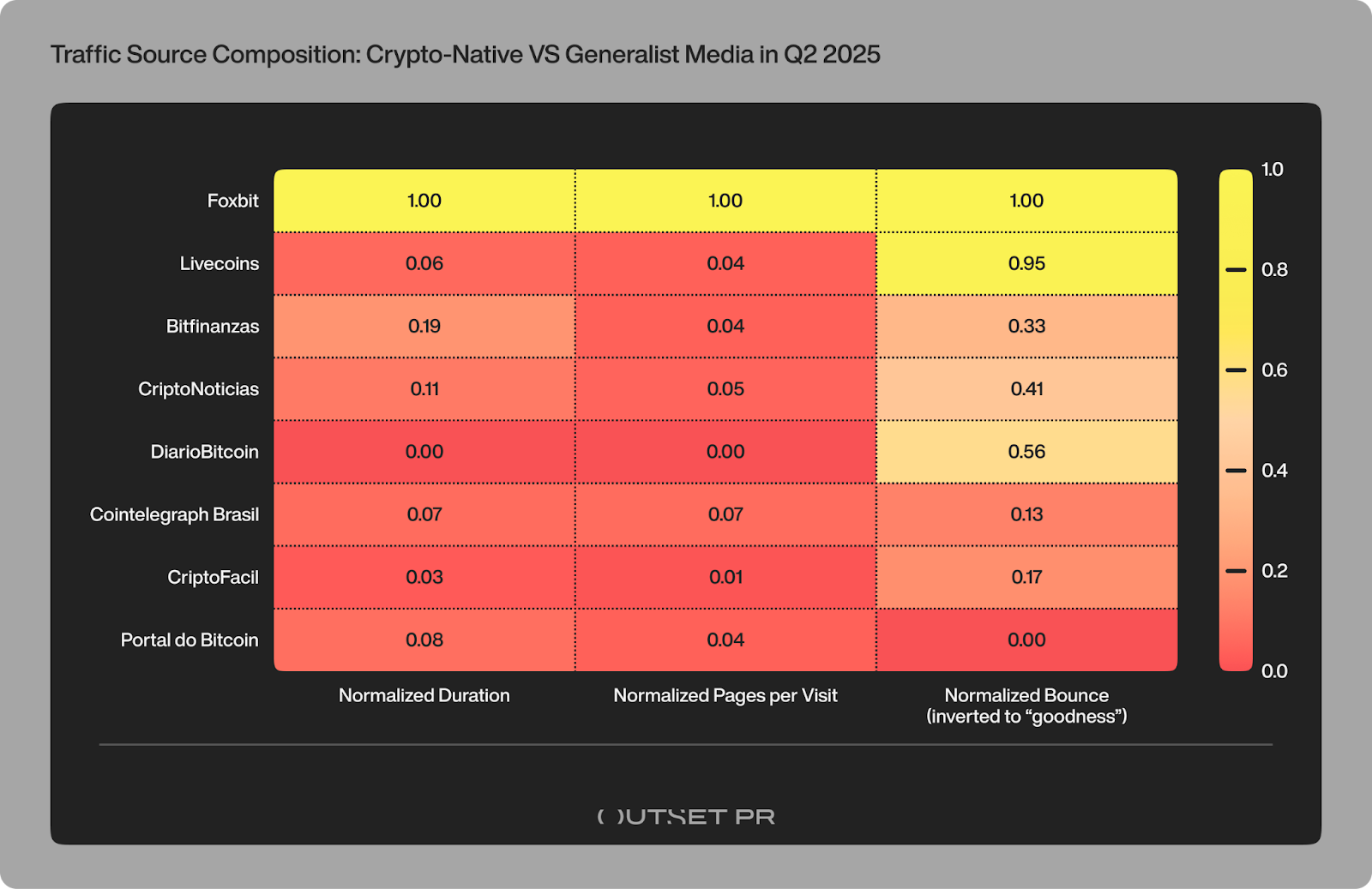 The data brief, powered by the agency’s proprietary intelligence Outset Data Pulse, evaluates eight crypto-native outlets representing 74% of regional crypto traffic, using Similarweb data (desktop + mobile) to standardize visit quality metrics. These include CriptoNoticias, Cointelegraph Brasil, Bitfinanzas, Livecoins, DiarioBitcoin, Foxbit, CriptoFacil, and Portal do Bitcoin.