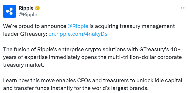 Ripple acquires GTreasury for $1 billion amid plans to expand its corporate crypto treasury capabilities