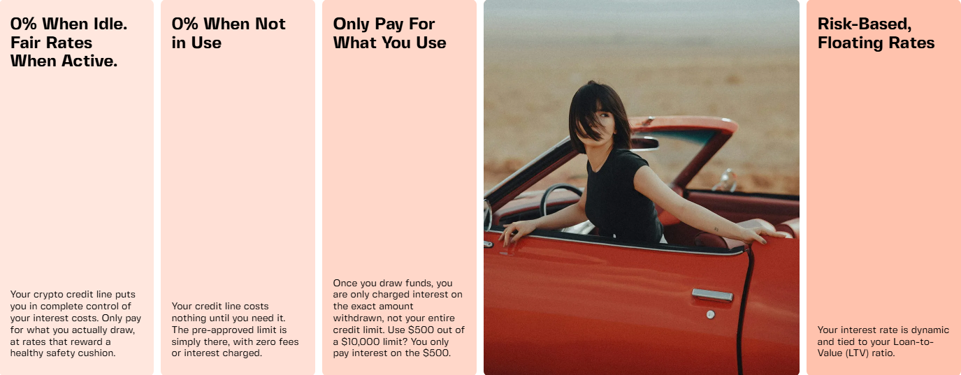 Clapp uses a revolving credit model similar to a credit card, but backed by crypto. You lock in your collateral and receive a credit limit. From there, the mechanics are simple: