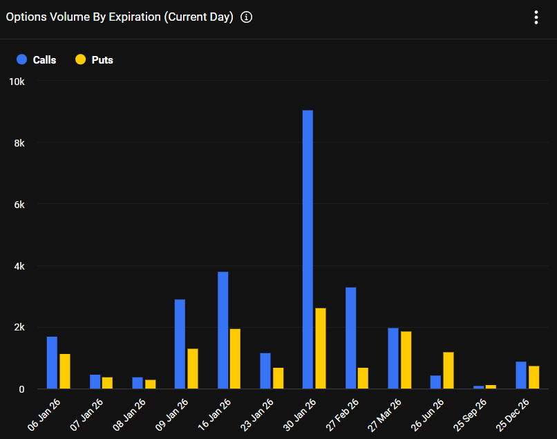 Nearly 10,000 BTC call options for the January 30, 2026 expiry were purchased on Deribit, pointing to growing leveraged exposure to the upside. Such concentrated activity in longer-dated calls is typically associated with institutional or sophisticated traders positioning for continued strength rather than short-lived volatility.