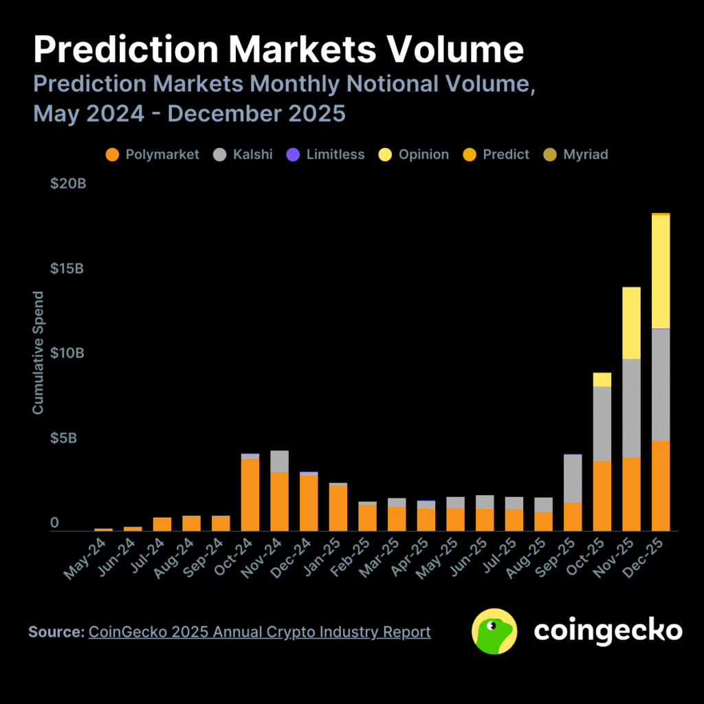 5. Les marchés de prédiction ont vu leurs volumes croître de +302,7% en 2025, atteignant 63,5 G$