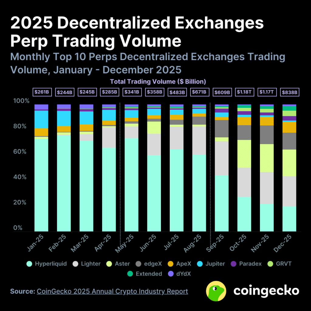 L’augmentation du volume de trading a été stimulée par des incitations et du farming d’airdrops sur des échanges tels que Lighter, Aster, edgeX, GRVT et Paradex. Hyperliquid est resté le perp DEX le plus actif en 2025, bien qu’il ait été dépassé par Lighter au T4. Hyperliquid et Lighter figurent désormais parmi les 10 plus grands échanges perpétuels par volume annuel, avec respectivement 2,9 billions et 1,3 billion de volume de trading.