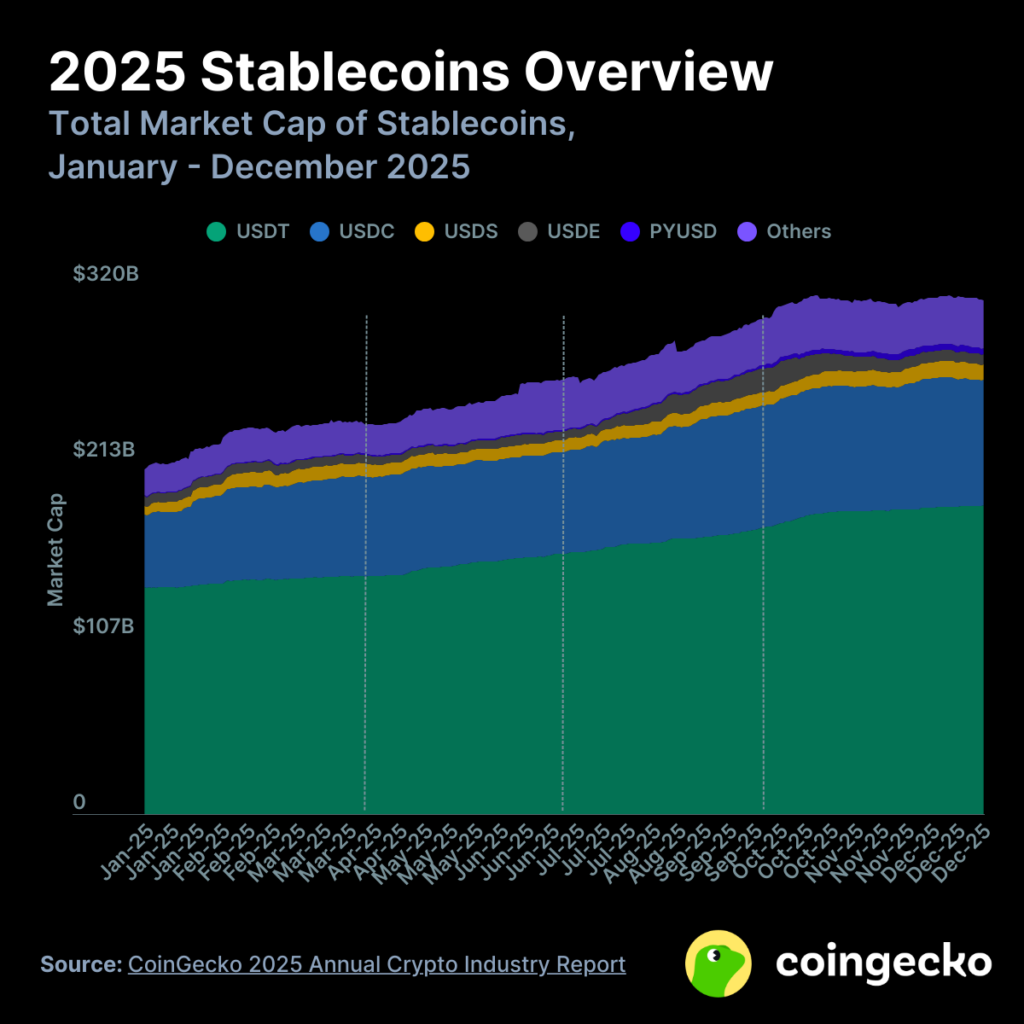 2. La capitalisation du marché des stablecoins a augmenté de +102,1B$ (+48,9%) en 2025, atteignant un nouveau record historique de 311B$